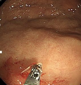 頭が胃粘膜内に残ってしまわないように、アニサキス虫体を慎重に引き抜いていきます。