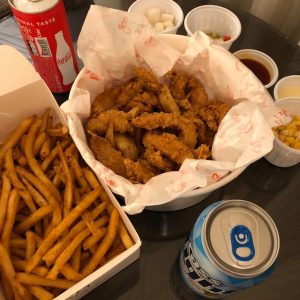 テイクアウトで骨なしクリスピーフライドチキンとフライドポテト!一度は食べてみたかった韓国のチキン。普通にサクサクで美味しい。ただ、二人で食べるには量が多すぎました💦