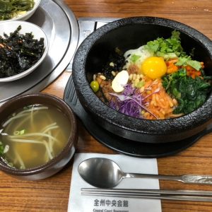 こちらも有名店! 石焼ビビンバをいただきました。オリジナルのコチュジャンは辛すぎず具材も種類が多く美味しいビビンバでした。