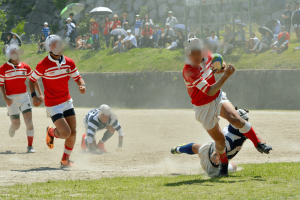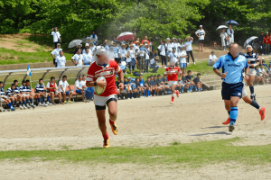 しかし、2本トライを返されて一時逆転されるものの、前半終了間際にインターセプトからトライを奪い]14-10とリードして折り返します。
