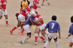 後半に入っても草ヶ江のFBが巧みなステップで相手を抜き去りゴール中央に飛び込みトライ!ゴールも決まり21-0とします。