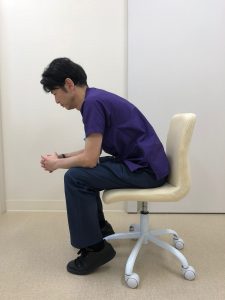ポイントとしては、つま先を立てて(あるいは低い足台を置いても可)、前傾姿勢になることです。例えるなら、ロダンの「考える人」の姿勢ですね。