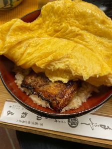 「かねよ」で食べたこのうなぎ。上に蓋から飛び出るほどの卵焼きがのっています。