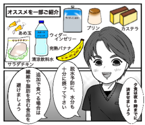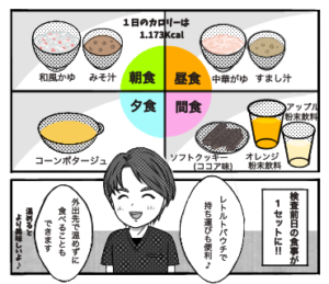 検査前日は食事の摂り方が大切であり、朝・昼・夕ともに食物繊維の多い食材、種のある食材、油分が多いメニューを避けていただき、消化の良いものを食べて頂きます。