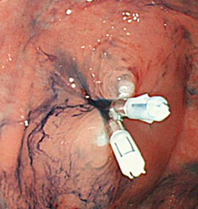 穿刺針をポリープの下の粘膜下層に穿刺し、生理食塩水を粘膜下層に注入してポリープを膨隆させます。スネアと呼ばれる針金で出来た輪でポリープと周囲の正常粘膜を併せて掴み、高周波電流でポリープを切除します。高周波電流で切除した場合、通電された切除面はのちに潰瘍を形成し、後出血や腸に穴が開く穿孔のリスクとなることがあるため、クリップでしっかり創部を縫縮します。