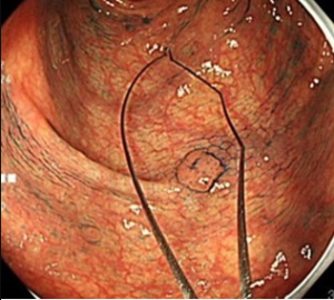 cold forceps polypectomyは、ポリープの切除に高周波電流を用いないため、切除後の傷からの後出血や腸に穴があく穿孔などの偶発症の危険性が低い切除方法です。
