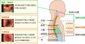 食道の上部は、咽頭(口から食道へと食べ物が通る通路、鼻から気管へと空気が通る通路)、喉頭(気管の入り口)とつながっています。