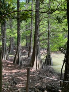 時期や条件が揃うともっと神秘的な光景を見ることができるようですが、あいにく晴れが続いていたため池の水の推移が低く落羽松(ラクウショウ)の木の根元が丸見えで少し残念。