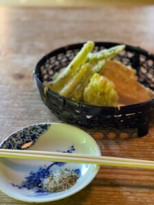 ざる蕎麦とこんにゃく寿司、季節の天麩羅盛り(カナトフグ、甘長唐辛子、スナップエンドウ、島らっきょう、さつま芋、生ベーコン)をいただきました。