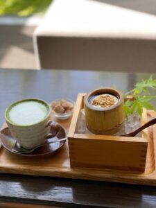 豆乳もち 黒蜜きな粉かけ、ホット抹茶ミルクでほっと一息。