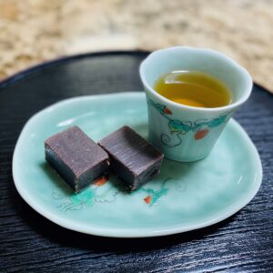 玉嶋屋さんの羊羹の最大の特色は、羊羹の表面が結晶化した白い砂糖の膜で覆われていることです!