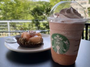 スタバの白桃&アールグレイケーキと桃MOREフラペチーノです。周りの女子グループがこのフラペチーノを片手に写真を撮っている中、私も立ち上がり、角度や光の差し込み具合に気をつけながら写真を撮りました。桃は好きなフルーツベスト3に入ります。ぜひ一度ご賞味を。