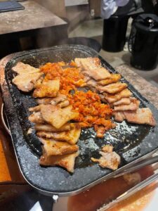 豚バラ肉を鉄板で焼いて、サンチュやエゴマの葉に巻いて、キムチやにんにく、サムジャンと一緒にいただきます。