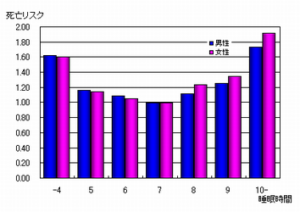 これは北海道大学大学院の玉暖暁子教授が「睡眠時間の長さ」と「10年後の死亡危険率」の関係について調査したデータです。